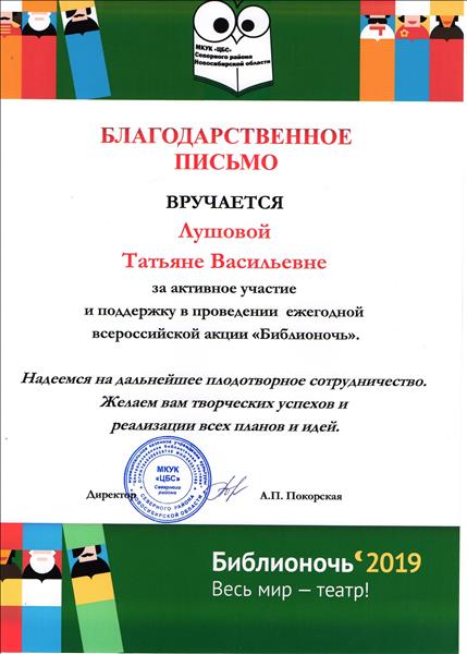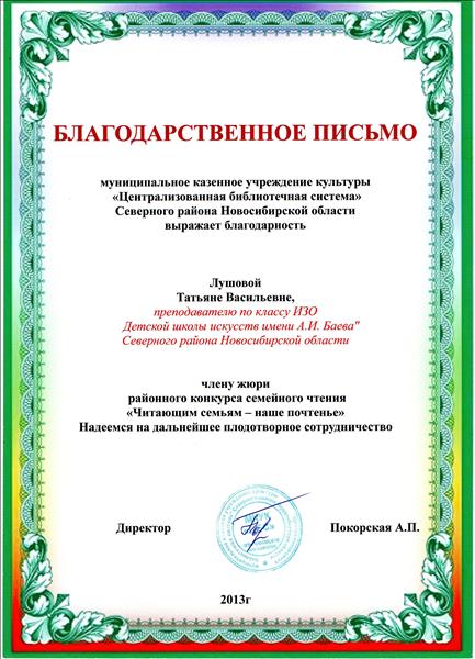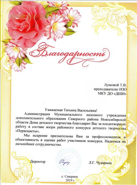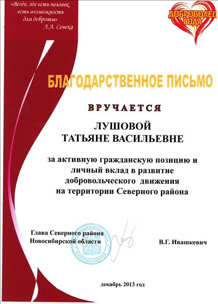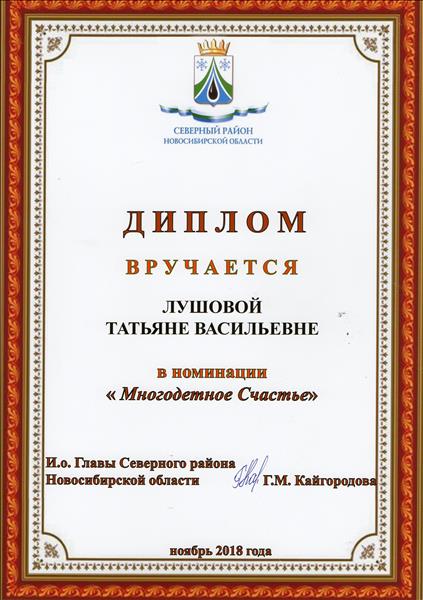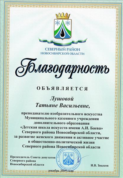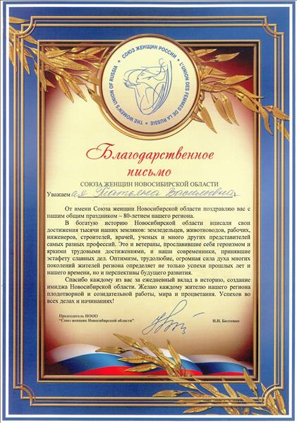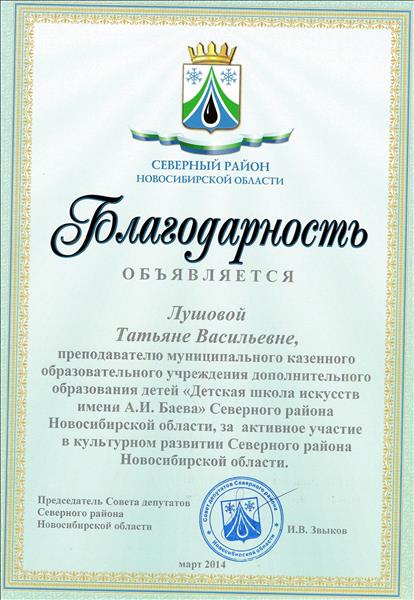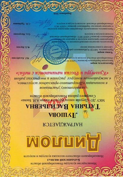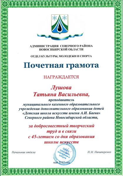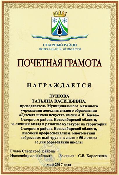 Почетная грамота за личный вклад в развитие культуры на территории Северного района Новосибирской области, высокий профессионализм, многолетний добросовестный труд и в связи с 50 - летием со дня образования школы