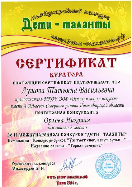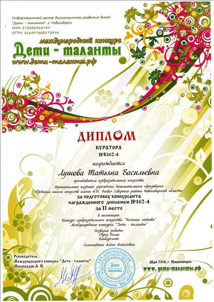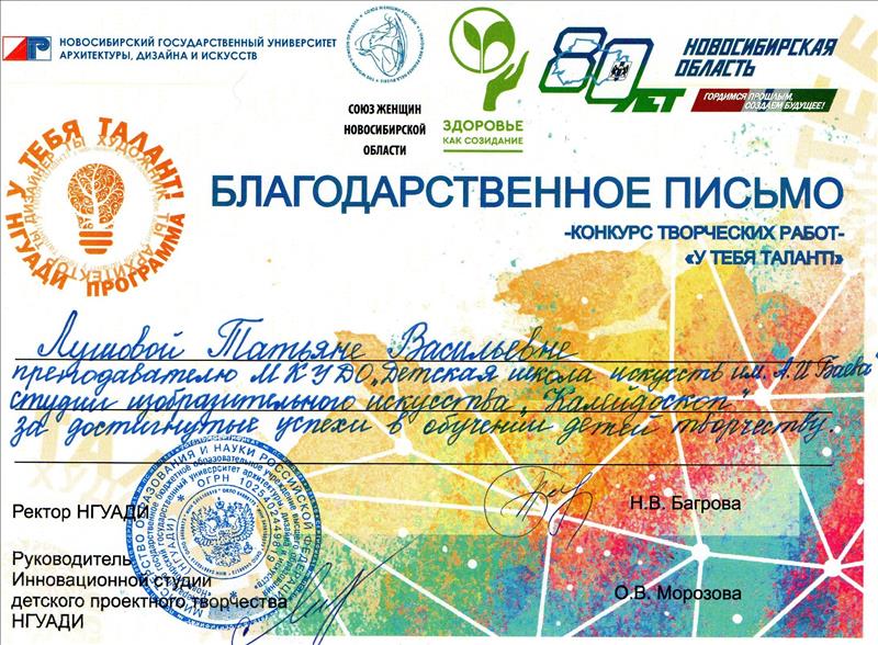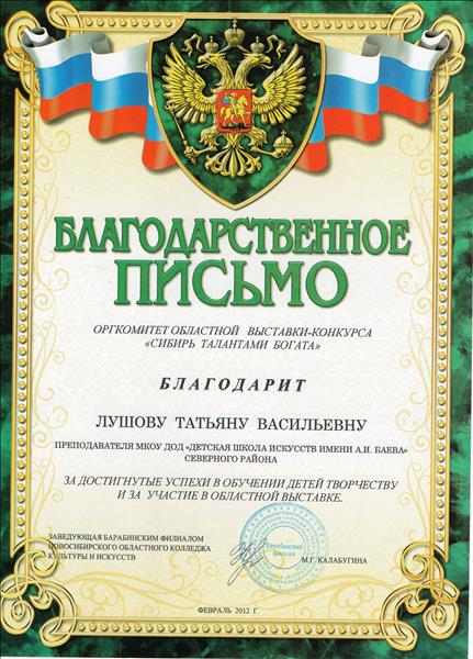 Благодарственное письмо оргкомитета Областной выставки - конкурса "Сибирь талантами богата", за достигнутые успехи в обучении детей творчеству и за участие в областной выставке.