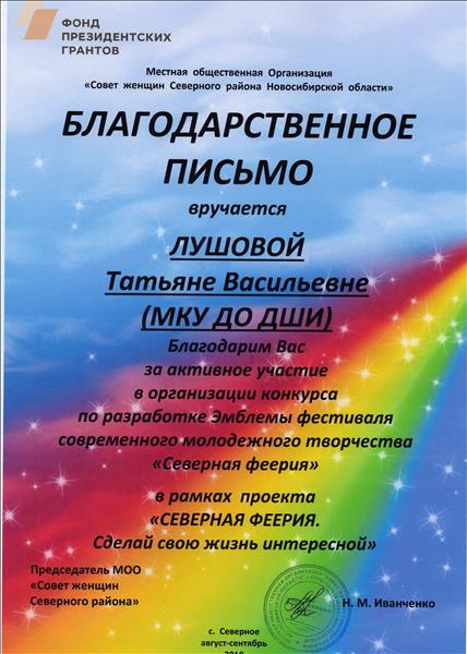 Благодарственное письмо за активное участие в организации конкурса по разработке Эмблемы фестиваля современного молодежного творчества "Северная феерия"