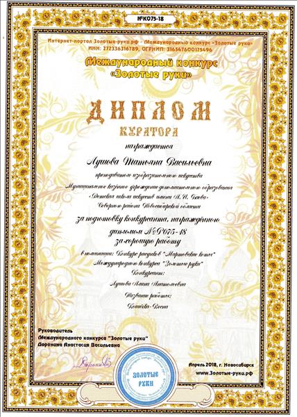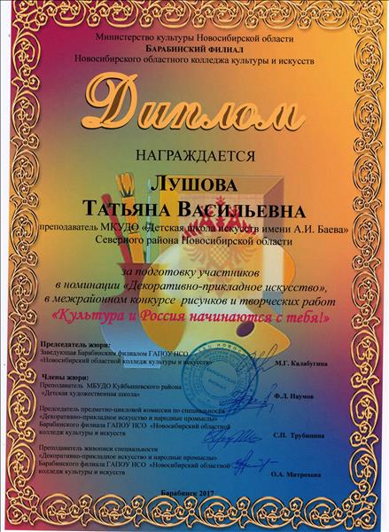 Диплом за подготовку участников в номинации "Декоративно - прикладное искусство", в межрайонном конкурсе рисунков и творческих работ "Культура и Россия начинаются с тебя!"