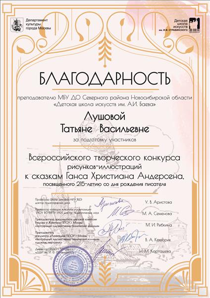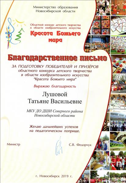Благодарственное письмо за подготовку победителей и призеров областного конкурса детского творчества в области изобразительного искусства "Красота Божьего мира"