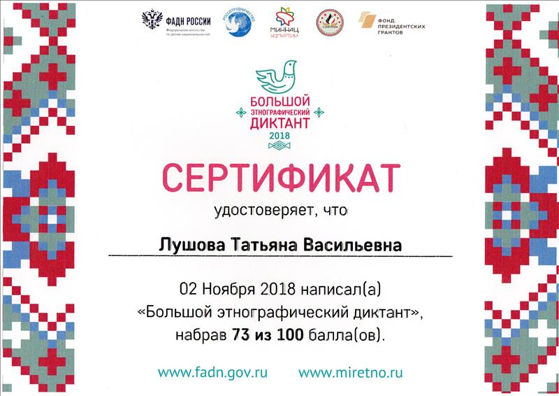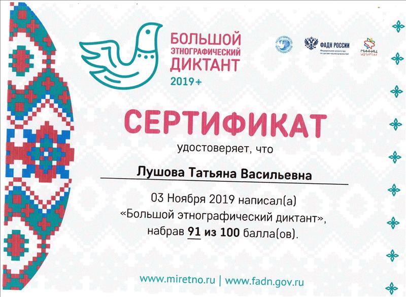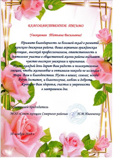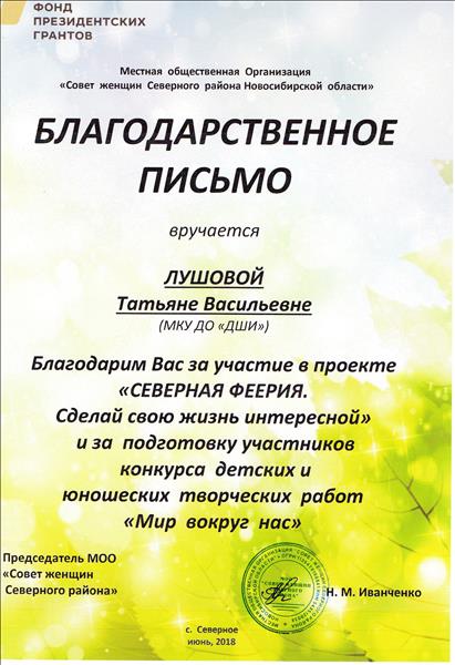 Благодарственное письмо за участие в пректе "Северная феерия. Сделай свою жизнь интересной" и за подготовку участников конкурса детских и юношеских работ "Мир вокруг нас"